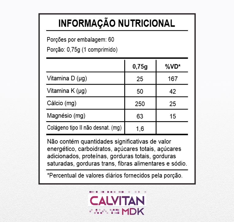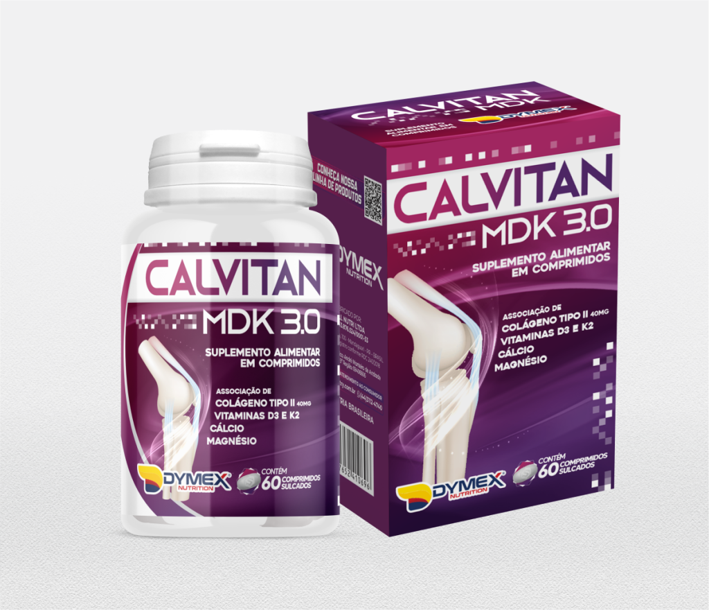 O Calvitan MDK é um suplemento que combina Colágeno Tipo II, Vitamina D3 e K2, Cálcio e Magnésio,que auxilia na saúde de ossos e articulações.