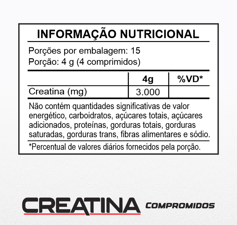 Creatina monohidratada e amido, antiumectantes: estearato de magnésio, celulose microcristalina e dióxido de silício.