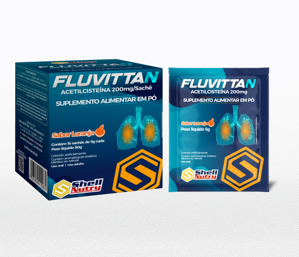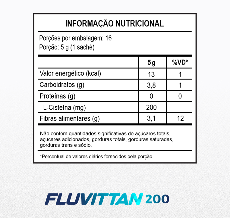 Acetilcisteína, maltodextrina, agente de massa: polidextrose, acidulantes: ácido cítrico e ácido tartárico, estabilizante: citrato trissódico, antiumectantes: fosfato tricálcico e dióxido de silício, edulcorante: sucralose, aromatizante: aroma sintético idêntico ao natural de laranja, corante: amarelo crepúsculo.