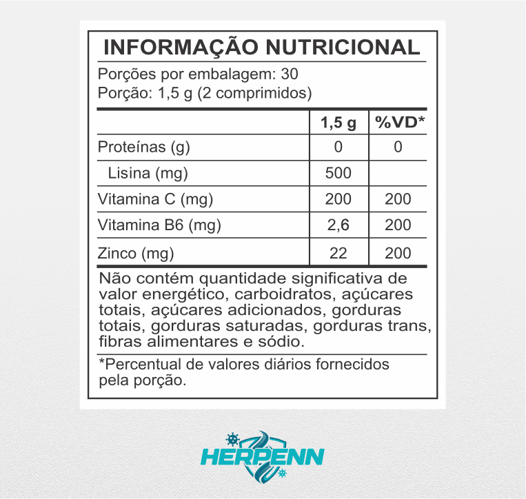 Cloridrato de L-lisina, ácido ascórbico, bisglicinato de zinco, cloridrato de piridoxina e amido, antiumectantes: estearato de magnésio e dióxido de silício.